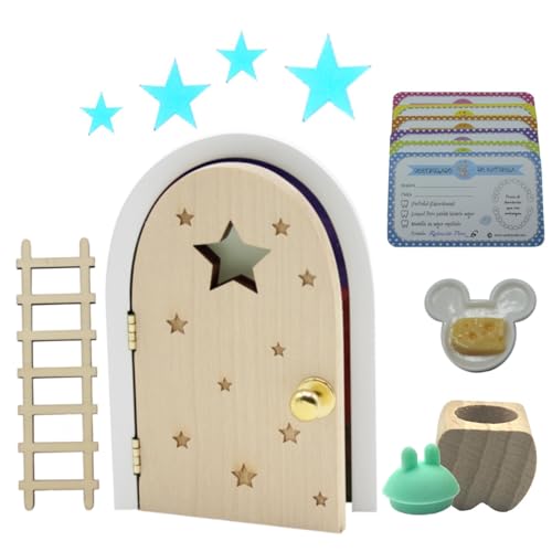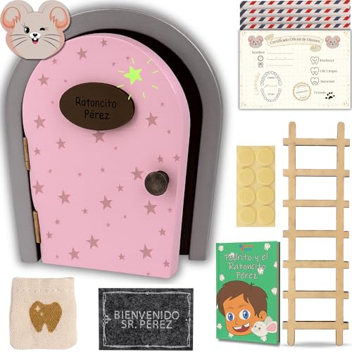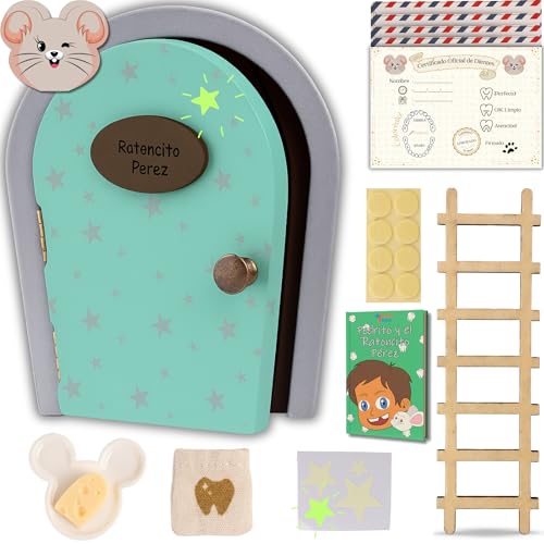 - 🐭 DETALLES EXCLUSIVOS 🐭 Incluye una Puerta Mágica con bisagras que se abre y se cierra con fondo mágico, una escalera de madera, un felpudo o un plato con quesito, una bolsita para los dientes, stickers adhesivos para sostener la puerta, estrellitas de pegatina luminiscentes y unos originales certificados de dientes.